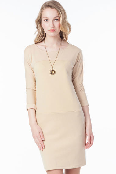 Нежное платье футляр бежевого цвета, с длинными рукавами и большой округлой горловиной.