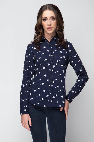 Модная темно-синяя блузка с принтом "звезды". Модель классического приталенного кроя, на груди накладной карман.