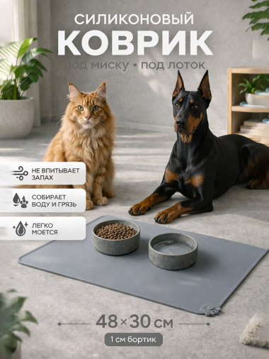 Коврик под миску для кошек и собак серый силиконовый 48х30см